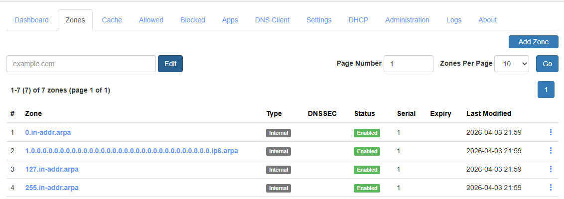On peut vérifier que les zones et sous-zones ont bien été créées dans l’administration de Technitium