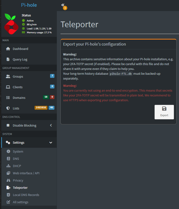 Faire un extract de la configuration PiHole dans System → Settings → Teleporter → export